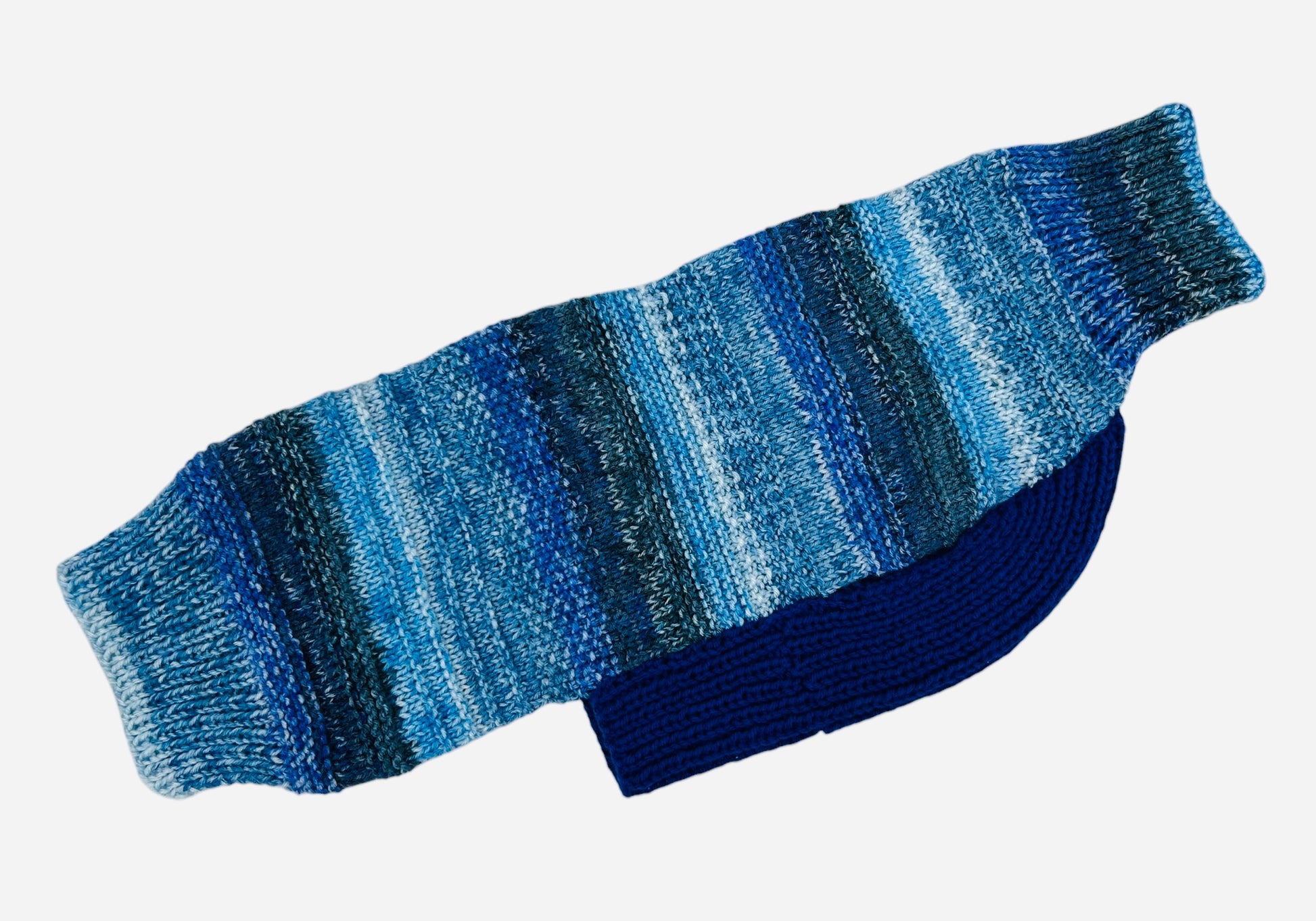 Hand-knitted dog sweater made to fit a whippet's unique body type. This sweater will also fit medium-sized breeds with narrow heads and deep chests similar in shape to whippets.