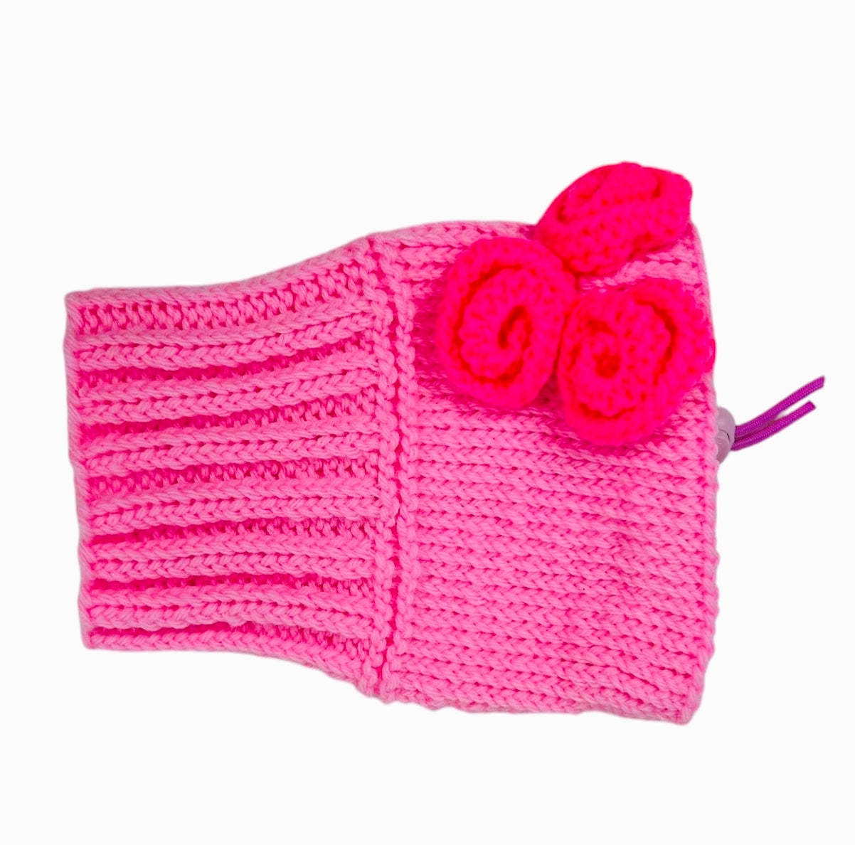 Rose snoods are super sweet and girly. Hand-knitted dog snood to keep your hound's ears warm when the weather turns cold. Features a drawstring closure to keep the snood securely in place.