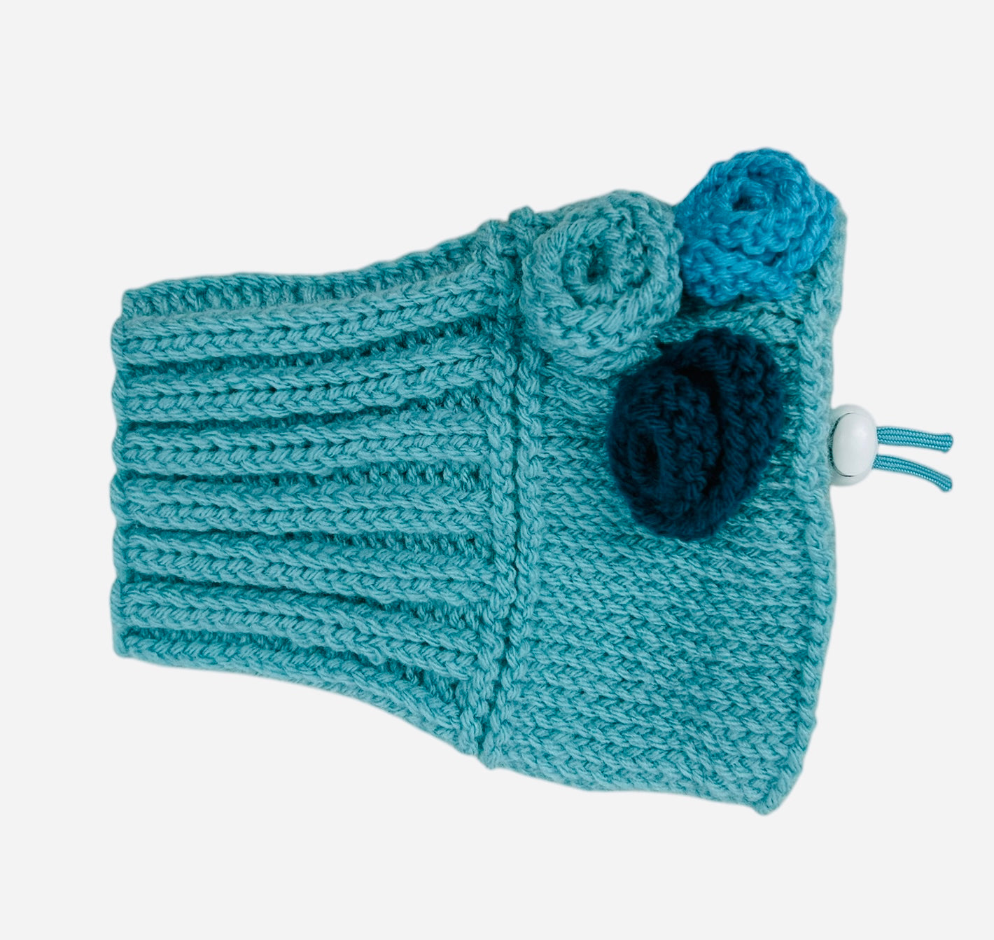 Rose snoods are super sweet and girly. Hand-knitted dog snood to keep your hound's ears warm when the weather turns cold. Features a drawstring closure to keep the snood securely in place.