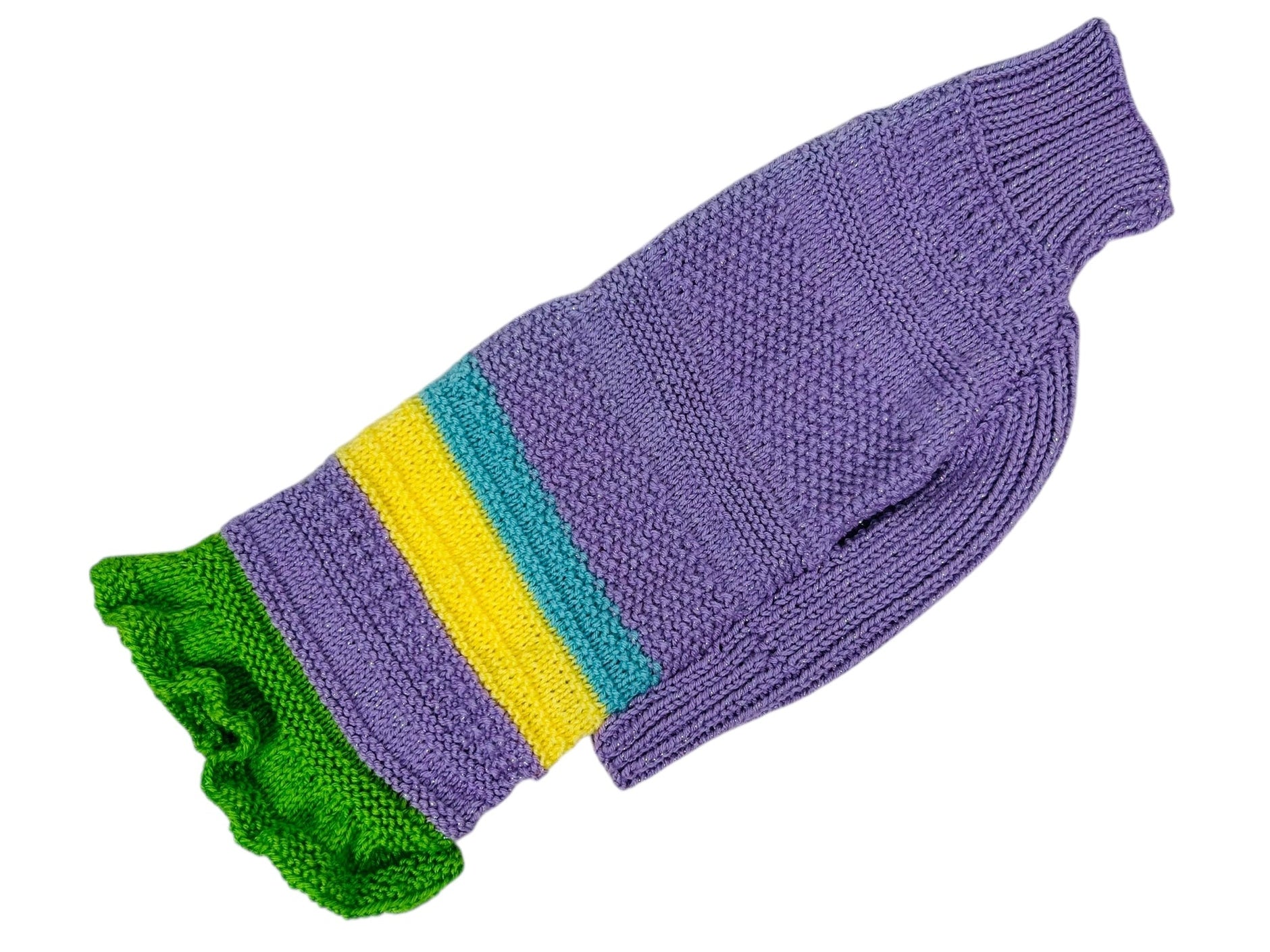 Hand-knitted dog sweater with adorable ruffles made to fit a whippet's unique body type. This sweater will also fit medium-sized breeds with narrow heads and deep chests similar in shape to whippets.